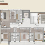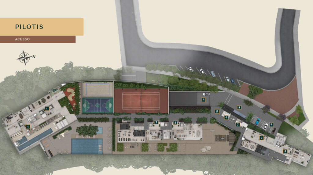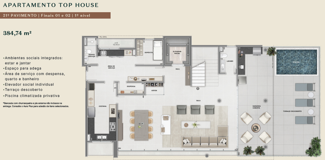 Primeiro Pavimento: . Ambientes sociais integrados – estar e jantar . Adega . Área de serviço com despensa, quarto e banheiro . Elevador social individual . Terraço descoberto . Piscina climatizada privativa