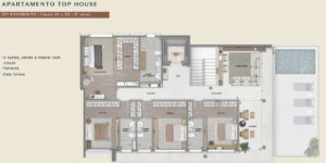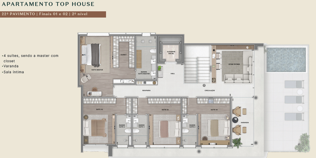 Esta cobertura possui 4 suítes no 2º pavimento e toda a área social e de lazer no 1º pavimento.